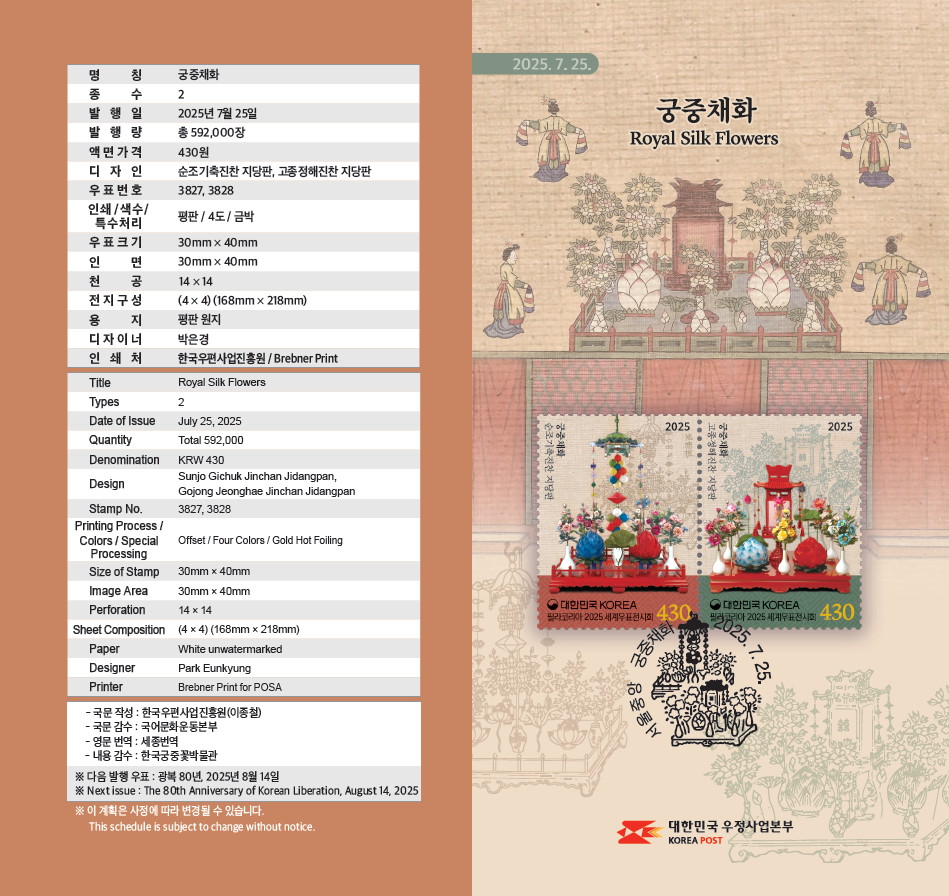 '궁중채화' 기념우표는 2025년 들어서 열두 번째로 발행된 기념우표입니다.